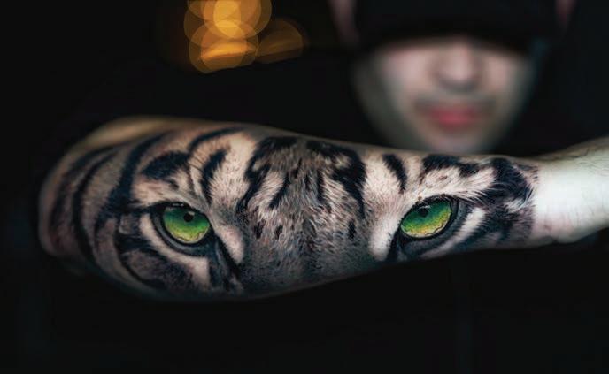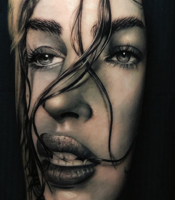 other artists and what are some of the challenges of doing so? The collaboration I did with Koral was a piece that came from hours of designing and multiple trials and changes to achieve a unique result—with the added complexity of doing it at a convention. I think the most difficult part of a collaboration is to show the identity of both artists in a tattoo harmoniously.