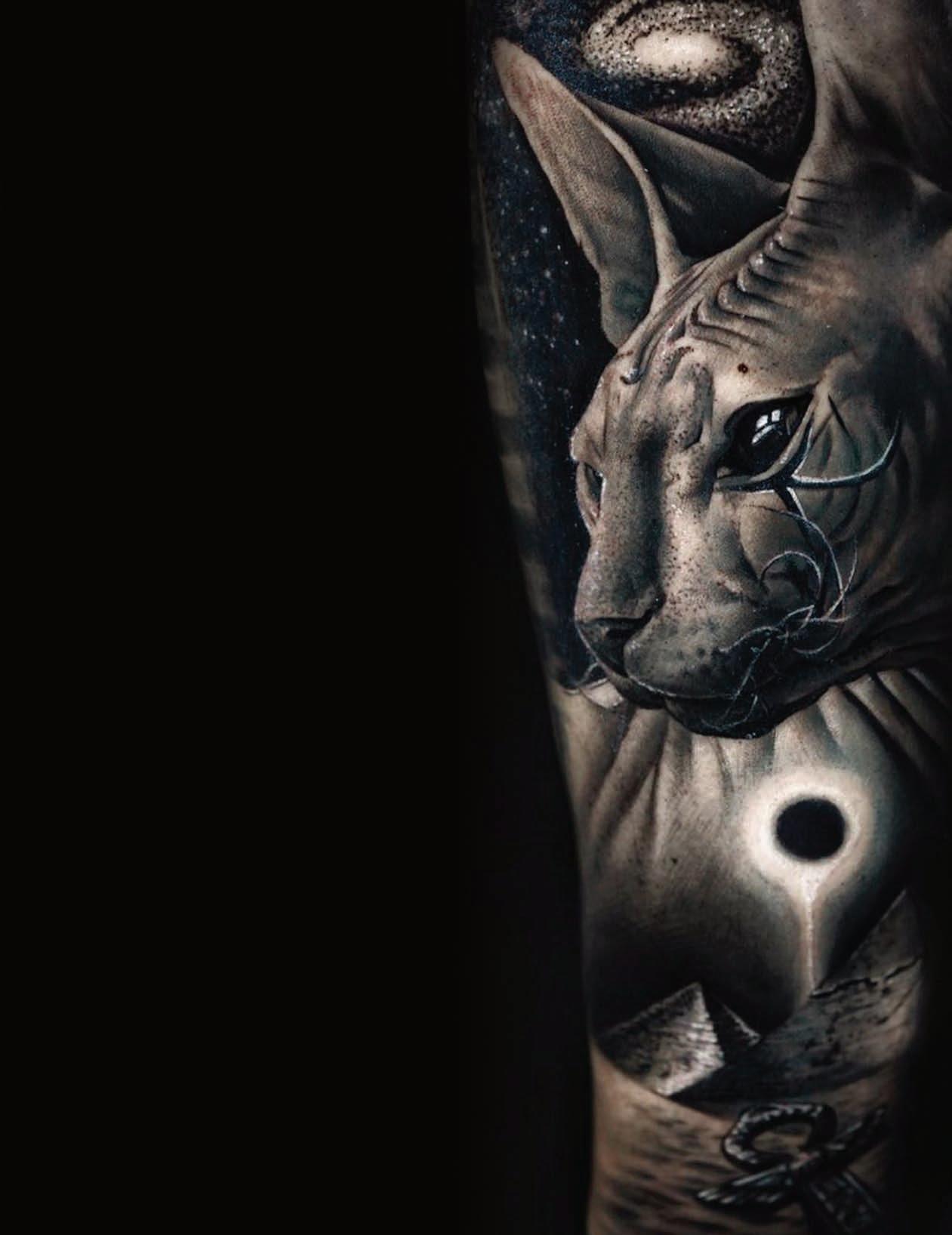 You do use color sparingly in some black-and-grey pieces, often in the eyes. Can you tell us how and why you do so? Some clients have this special request. Most of the time my clients highlight that they want the eyes “as real as possible.” Colors, well applied, can create a pop-out sensation, which is great for something as important as the eyes. When I do it, I tend to leave the eyes for the end. I do the base with my regular black-and-grey technique and fill the final spaces with colors.