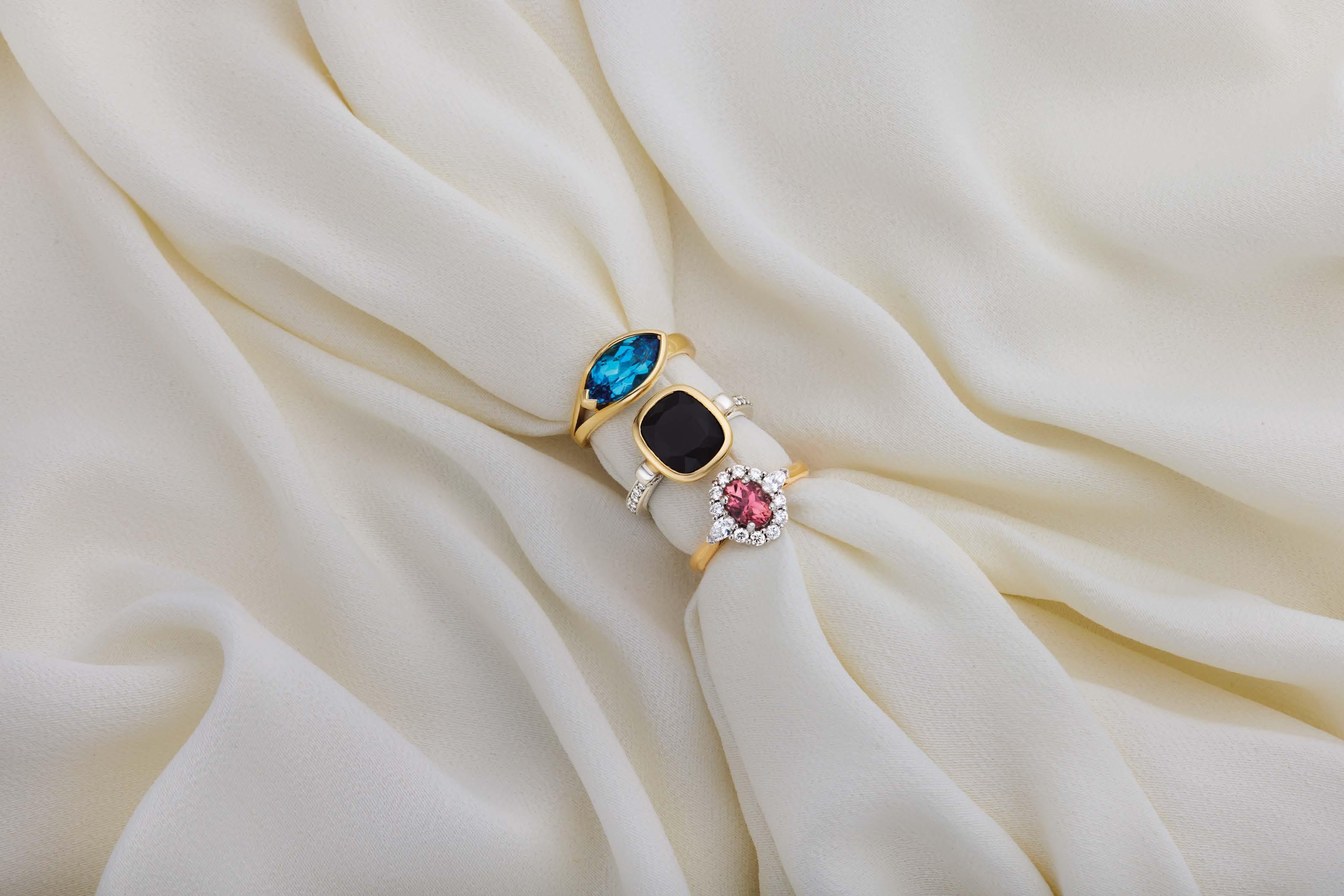 Rings from Barnaby's bench, from left, Fancy Sapphire & Diamond, London Blue Topaz and Five Diamonds.