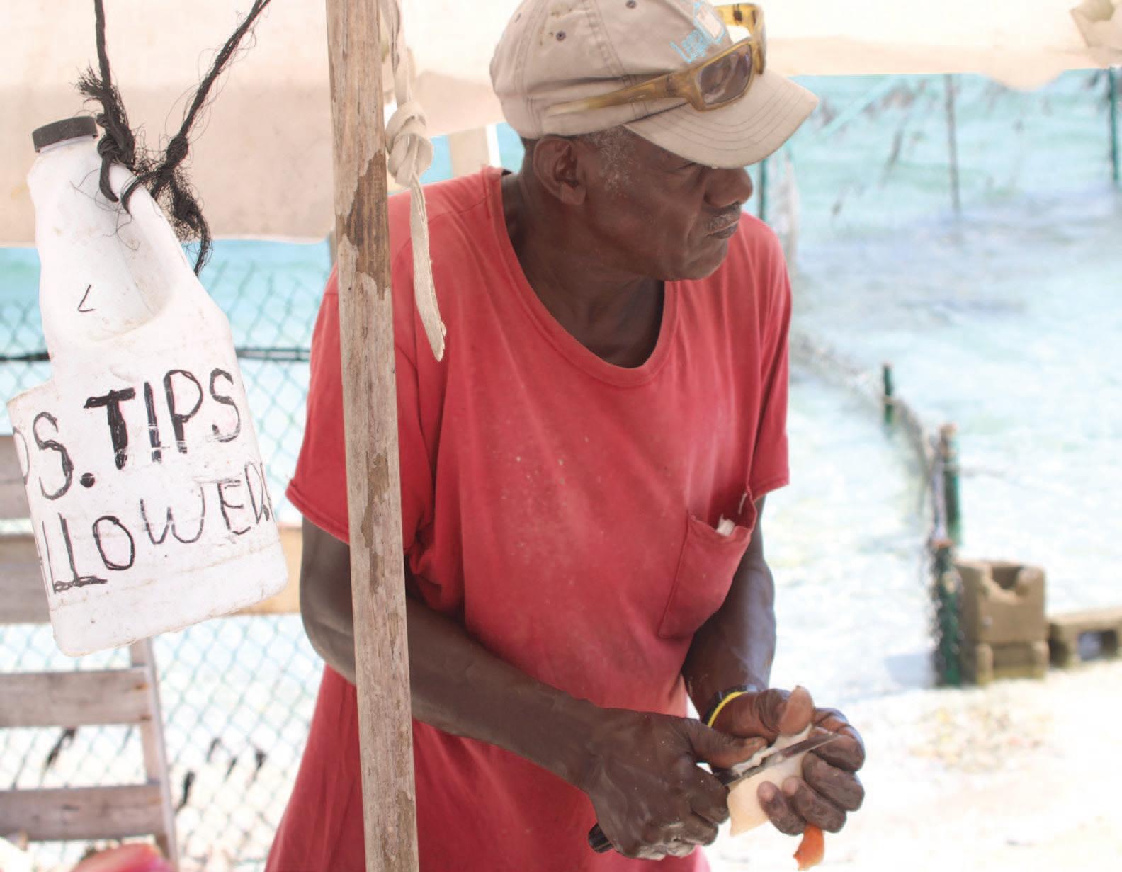 At the edge of the shore, standing unde an umbrella, was an older gentleman shucking conch. Behind him in the wat was a fenced-in area. Next to him was a long table under which two rows of conchs were corralled.