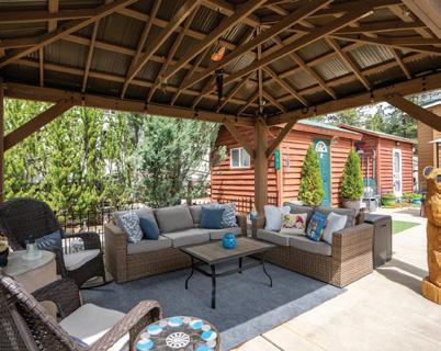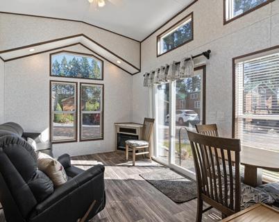 Skookum RV Resort, cozy 1Br/1Ba featuring a creekside covered deck, paver patio; a serene outdoor retreat. Faux stone skirting, cedar siding, storage shed w/office space, and a washer/dryer. Large kitchen with highend cabinetry, and a copper sink that gives the home a storybook-like, rustic charm. This private getaway is part of a community that offers many amenities.