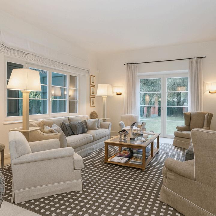 The interior design draws inspiration from the coastal elegance of Forte dei Marmi, embracing a natural, tactile palette: soft whites, sandy beiges, dusty blues, and muted greys Light flows gently through large windows and French doors, filtered by gauzy linen curtains and reflected in pale wooden floors and handmade ceramic finishes.