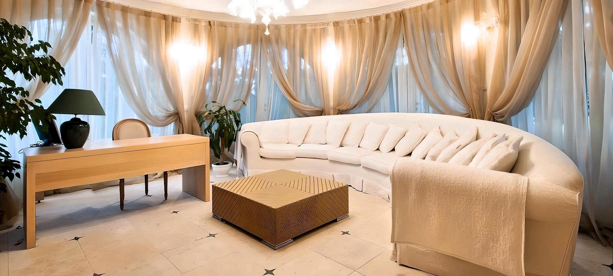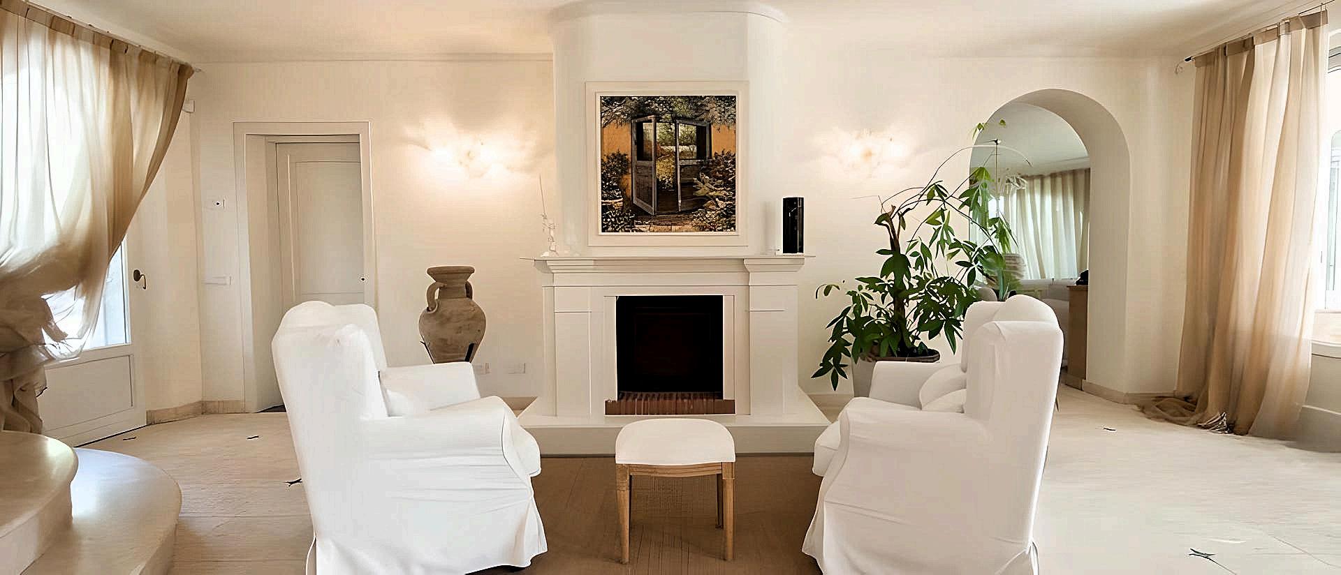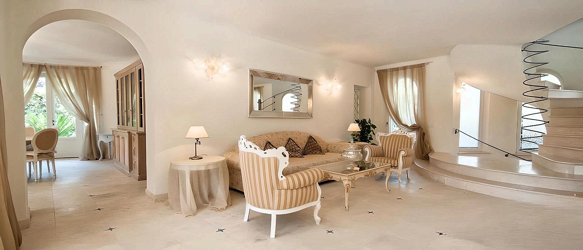 Stepping inside, you are welcomed by an atmosphere of refined beauty. The **interiors showcase the brilliance of Italian craftsmanship**: warm hues blend with rich wood grains, lustrous marble, lacquered surfaces, metals, mirrors, and exquisite textiles. Every detail, from soft draperies to elegant chandeliers, from marble columns to arched openings, exudes understated luxury.