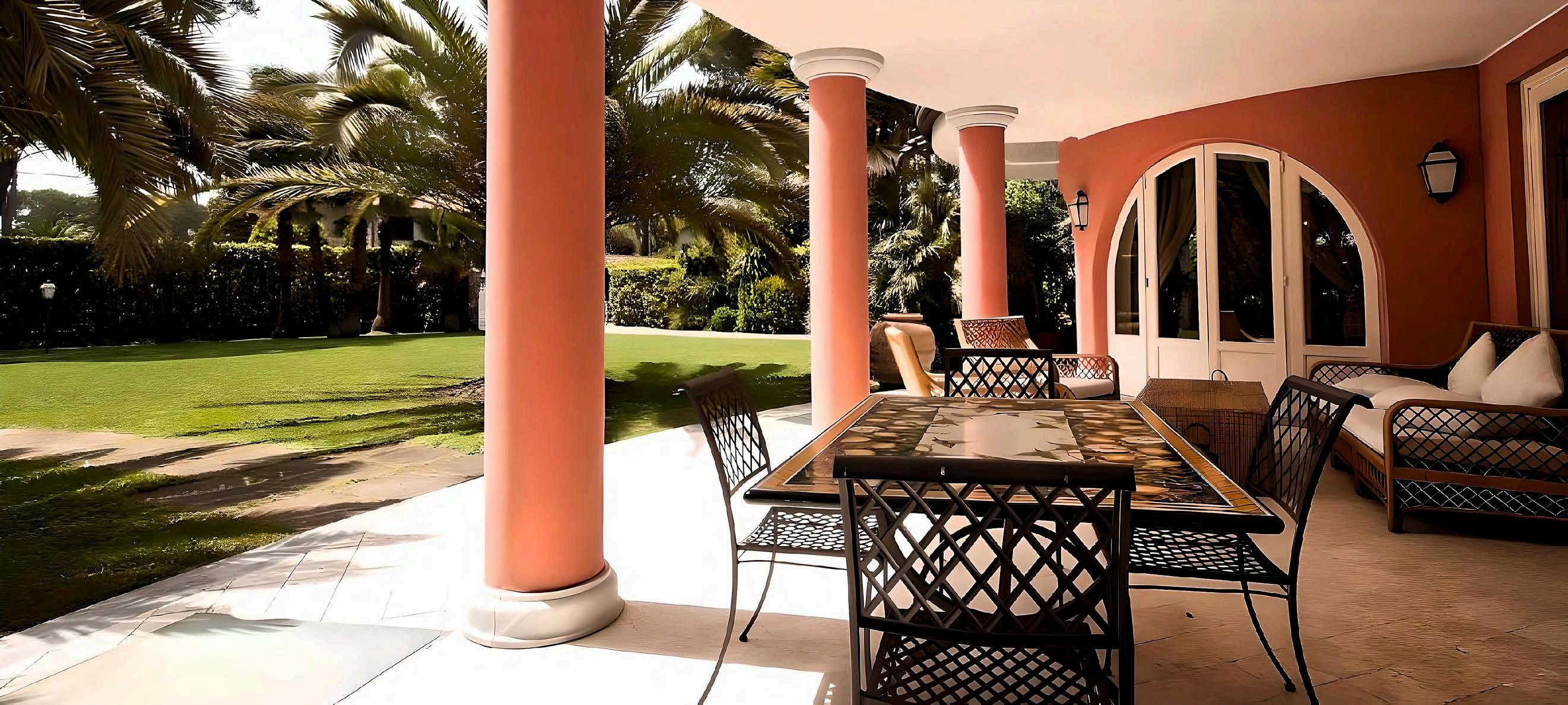 From the moment you arrive, the villa enchants with its architectural symmetry and lively hues, surrounded by a **lush 2,000-square-meter garden** adorned with palm trees, ornamental plants, and winding pathways. The property is fully enclosed and features two independent entrances—one for pedestrians and another for vehicles—leading to a covered parking area via a grand paved driveway