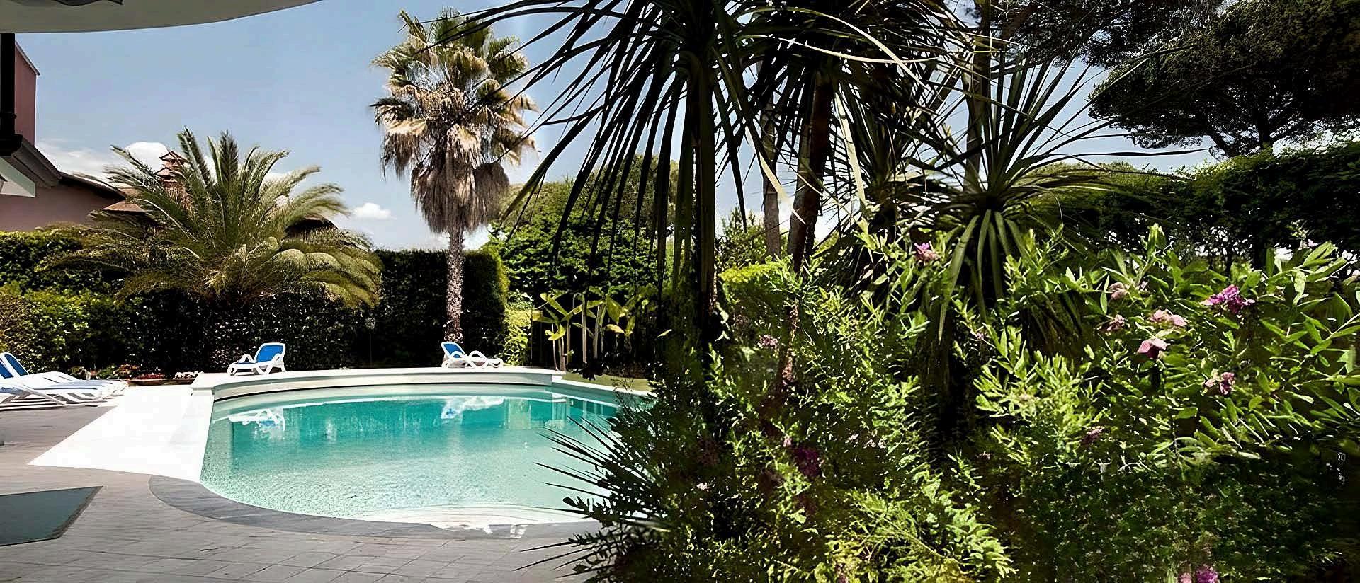 A semicircular porch with striking columns opens up to a **75-square-meter sun-drenched terrace**, providing an ideal backdrop for tranquil mornings or sophisticated evenings. On the eastern side, in complete privacy, you’ll find a **magnificent oval swimming pool** with an automatic cover, embraced by a shaded veranda perfect for hosting alfresco lunches and intimate candlelit dinners.