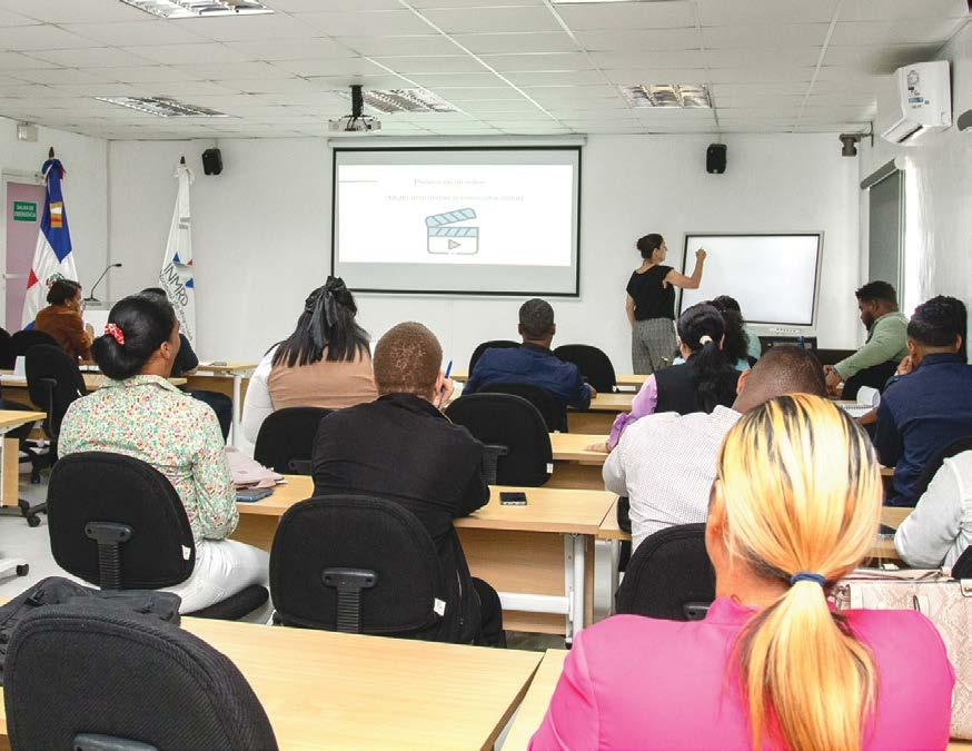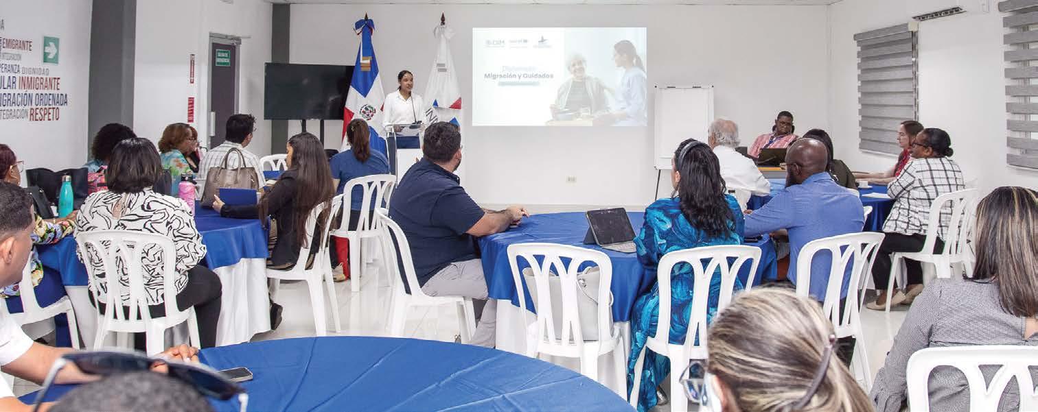 Consciente de la complejidad de la relación entre migración y cuidados, el INM RD ha incorporado este eje en su oferta formativa mediante el Diplomado Migración y Cuidados, dirigido a fortalecer las capacidades de servidores públicos, representantes de la sociedad civil y ciudadanía en general sobre los vínculos entre movilidad humana, derechos humanos y trabajo decente. Esta iniciativa promu eve una comprensión más profunda de la necesidad de incluir a las personas migrantes en las políticas nacionales de cuidados y de proteger sus derechos laborales dentro de un enfoque de dignidad y equidad.