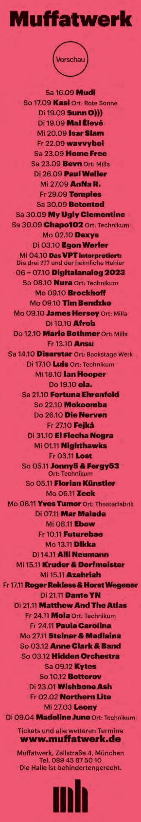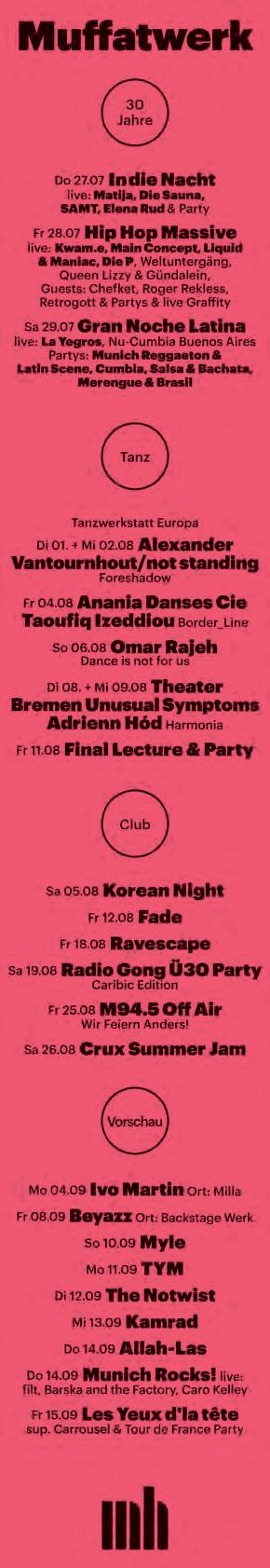Der August ist da: 31 Tage voller Sonnenschein, Freizeit und Möglichkeiten. Wäre da nicht die Inflation, die unser aller Geldbeutel gebeutelt hat, könnte es ein schöner Monat werden. Doch nicht verzagen, liebe Leute: München hat auch fürs leerere Portemonnaie im August viel zu bieten. Fangen wir mit Konzerten an: Noch bis zum 6.8. findet im Backstage das free & easy statt. Acts wie D.R.I. (1.8.), Sleepwalker’s Nation (2.8.) oder Vogelmayer (6.8.), diverse Rock-, Reggae-, Latinound Mundart-Parties sowie Diskussionen, Workshops und Filmvorführungen (u.a. Ex Drummer, Machete Kills) bieten bei freiem Eintritt Menschen mit ganz unterschiedlichen Interessen tolle Freizeitgestaltung.