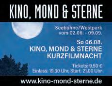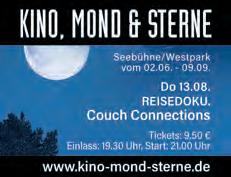 sätzlich 300 Liegestühle und eine Picknickwiese für die Gäste zur Verfügung. Für Speis und Trank sorgen diverse Foodtrucks und Bars, die übrigens auch vegetarische und vegane Spezialitäten anbieten. Am KinoKiosk kann man sich darüber hinaus mit klassischem Film-Food wie Popcorn und Nachos versorgen. Die Tickets für die Filmvorführungen kosten zwischen 9 und 15 Euro. Gezeigt wird zum Auftakt eine Preview vom neuen Eberhofer-Krimi „Rehragout-Rendezvous”, bei der einige Leinwandstars persönlich vor Ort sein werden. Außerdem werden das aktuelle „Indiana Jones“-Kinoabenteuer, die Fortsetzung „Enkel für Fortgeschrittene” in einer Premiere, der neueste „Mission: Impossible”-Film und der deutsche Krimi “Sonne und Beton” über die Großleinwand flimmern. Neben den abendlichen Filmvorführungen wird es auch ein KinderkinoProgramm auf der LED-Leinwand geben. Geöffnet ist von Mo bis Do ab 16 Uhr, Fr bis So ab 12 Uhr.