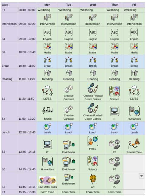 All students have a personalised timetable attached to their Chromebook, providing symbol based dual coding to encourage greater independence and mobility across the school�