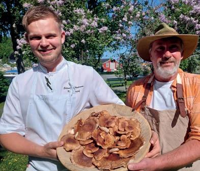 Her viser Jørgen Baumfelder (t.h.) fram eksklusiv sopp som er dyrket fram på gården i Leksdalen. Kjøkkensjef Erlend Andersen synes det blir topp å servere helstekt soppgris til martnaspublikum. Det blir god stemning.