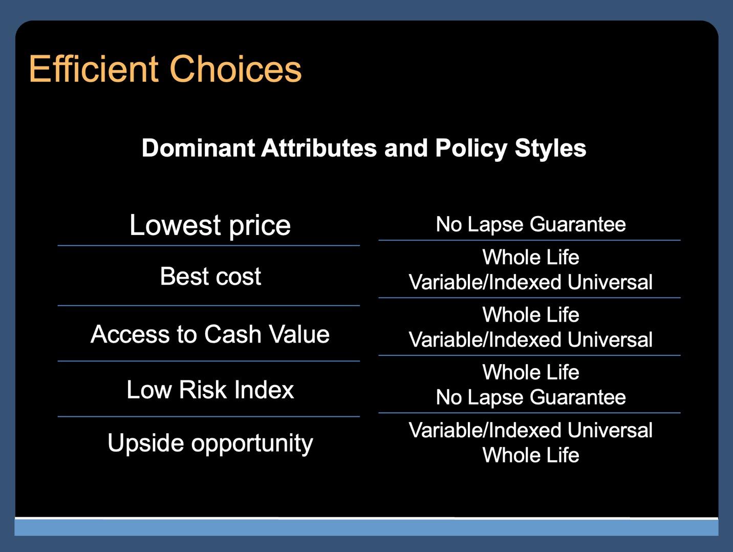These are largely incompatible ob jectives; not all can be derived from just one style of policy. But they can be achieved with a custom-proportioned use of an appropriate array of policies such as whole life, VUL, IUL and NLG