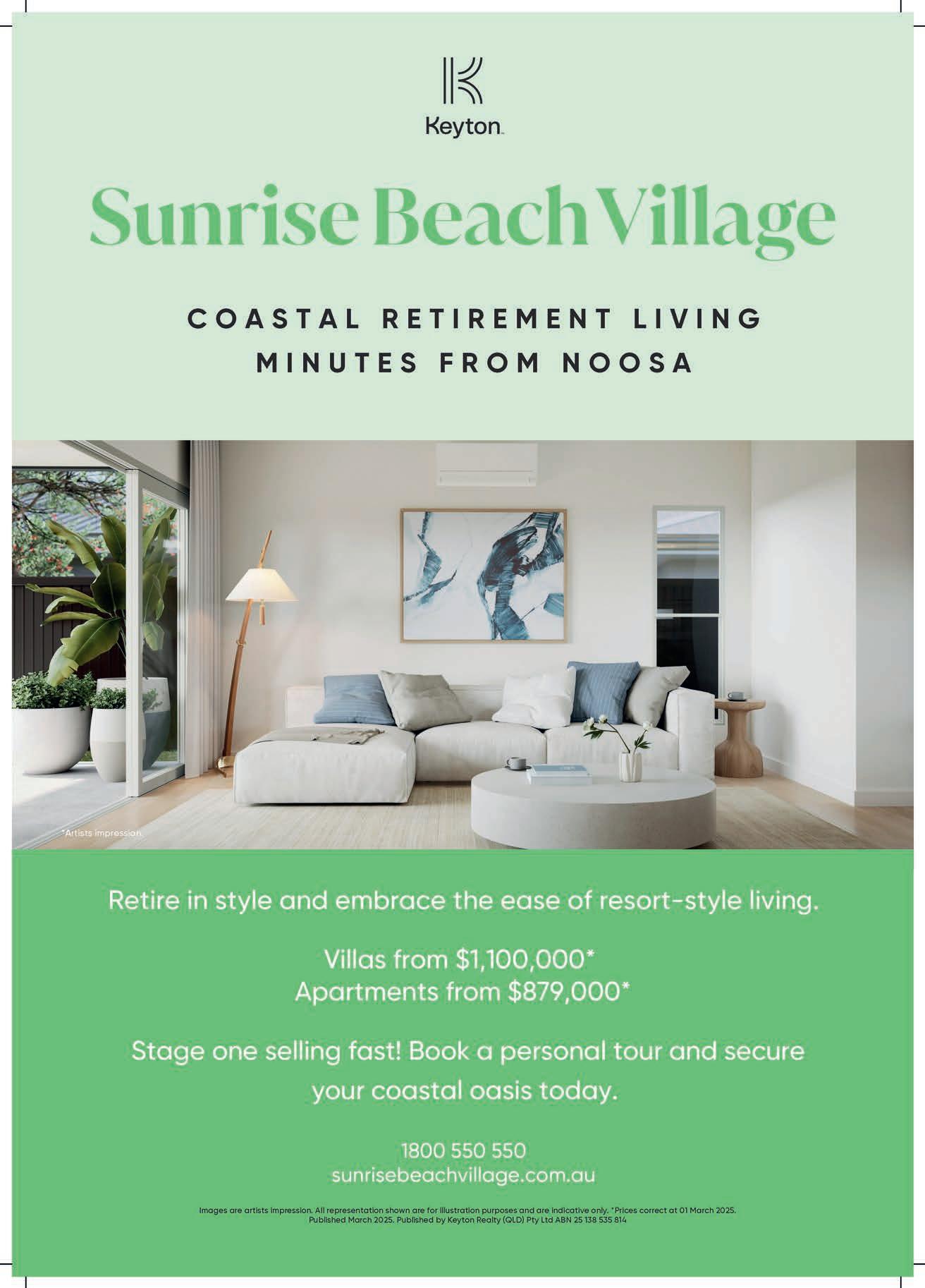 The joint project between Keyton and BlueCare, brings together the benefits of the existing Sunrise Beach Aged Care facility with a brand-new retirement village to deliver spacious two-andthree-bedroom units and an active, caring community with top-notch facilities in a highly desirable location, between Noosa National Park and pristine beaches and close to Noosa Junction and Hastings Street.