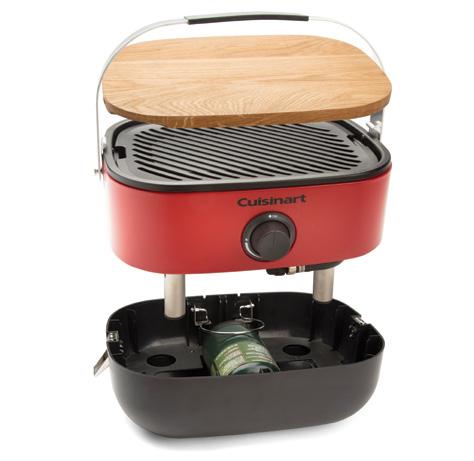 — This versatile and compact outdoor grilling system is ideal for any adventure. Its stack’n’go design ensures portability to various locations. The all-in-one grill features a comfortable grip handle and a wooden lid that serves as a chopping board. The porcelain enameled cast iron grates offer superior heat distribution and retention. The base includes a flip-out rack for secure propane tank storage, and clips near the grill legs neatly store the propane hose. $200