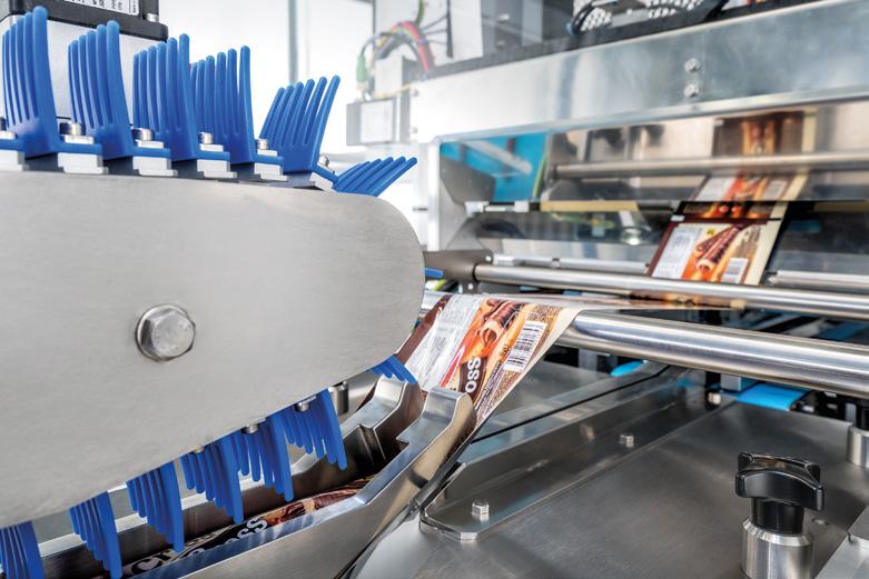 before placing them into the chain at the same time. This enables the performance of the pick & place process to be adapted to the specific format – and the output of 300 flowpacks per minute is maintained even with 600 packaged biscuit rolls. At a film speed of 60 m/min, the pre-grouped biscuit rolls are then packed into flowpacks and fed into an existing Schubert cartoner.
