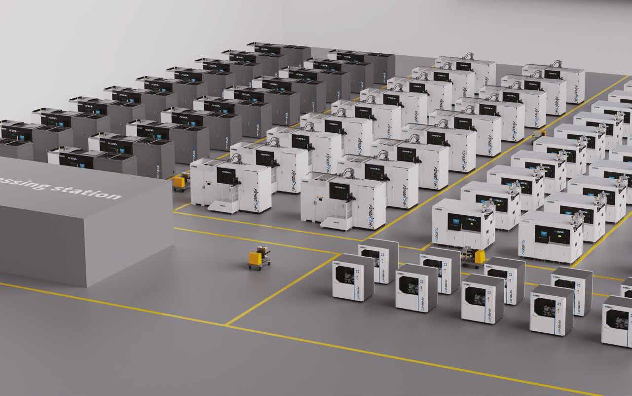 chamber to allow setup and cooling times to be uncoupled from the build process, thereby increasing manufacturing rates.