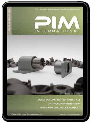 PIM International is the only business-to-business publication dedicated to reporting on the technical and commercial advances in the MIM, CIM, and sinter-based Additive Manufacturing industries. Available in both digital and print formats, PIM International is the perfect platform to promote your company to a global audience.
