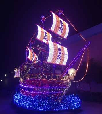 In this Journey of Lights parade float created by Miziker Entertainment for Chimelong Ocean Kingdom, digital imagery is pushed to the Pirate Ship sails, created by joining hundreds of color-changing LED light strips, to replicate full-motion video displays.
