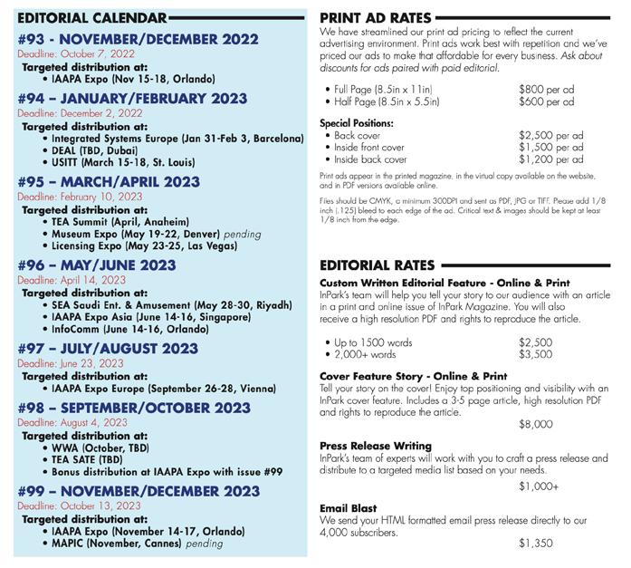 Contents © 2022 InPark Magazine. All rights reserved. Nothing in the magazine may be reproduced or used in any manner without the prior written permission of the magazine. InPark Magazine is not responsible for unsolicited manuscripts, photographs or illustrations. Such material must be accompanied by a selfadressed and stamped envelope to be returned.