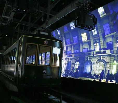 The installation comprises of a pre-show area and a three-act show. “Because of the small space, there are tons of lighting, electromechanical and scenic elements packed around the audience,” explains Roberdes. The 44-foot diameter turntable is split in half, allowing 65 guests seated on one half to view the first of three acts before rotating 90 degrees for Act Two and then beyond to 180 degrees for Act Three. Once there, the other side of the table is loaded with 65 more guests for Act One. Throughout the entire 20-minute show, moving scenery, shattered buildings, and video screens appear and disappear; projection mapping covers walls and ceilings, and rich sound fills each half of the theater. An inflatable, acoustic gasket and double thick walls had to be designed to prevent sound bleed between the two audience groups.