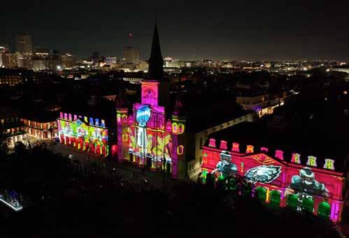 In New Orleans in 2025, Paul Whitney, BlueMedia, the NFL team and DreamLab Immersive transformed buildings in Jackson Square into a projection mapping show for Super Bowl LIX.
