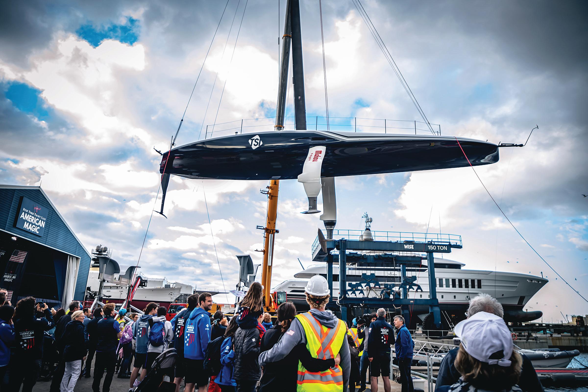PATRIOT CHRISTENED New York Yacht Club (NYYC) American Magic unveiled the AC75 racing boat Patriot on May 7 in Barcelona, Spain. Team members and their families gathered at their team base for a christening ceremony before the boat's inaugural sail. The foiling monohull is set to be tested and raced by NYYC American Magic this summer before the 37th America's Cup.