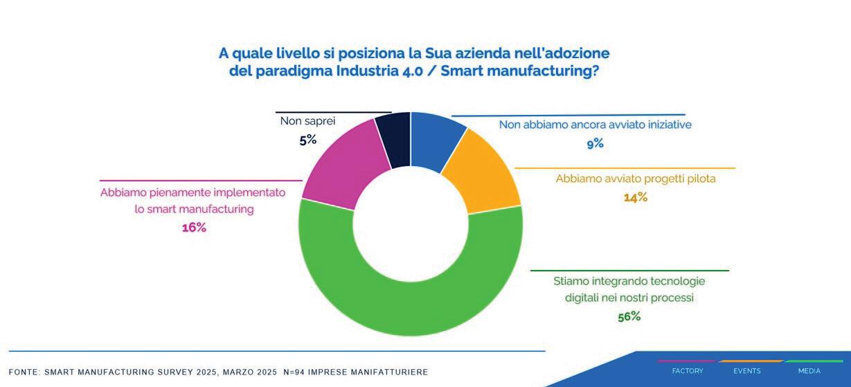 La spinta verso l'Industria 4.0 e 5.0 e lo smart manufacturing è un percorso intrapreso con decisione dalle aziende italiane, come evidenziato nella “Smart Manufacturing Survey 2025” di The Innovation Group. Se da un lato molte realtà sono in una fase di integrazione attiva delle tecnologie digitali, con un'attenzione crescente verso l'AI, la servitizzazione e la cybersecurity, dall'altro l'implementazione su larga scala è ancora limitata. La priorità nell'adozione di AI e Data Analytics è chiaramente orientata all'aumento di produttività ed efficienza, mentre la trasformazione dei modelli di business è considerata in misura minore. Nonostante i progressi, il cammino verso la completa maturità digitale è irto di ostacoli, tra cui spiccano i gap di competenze, la difficile integrazione tecnologica e le