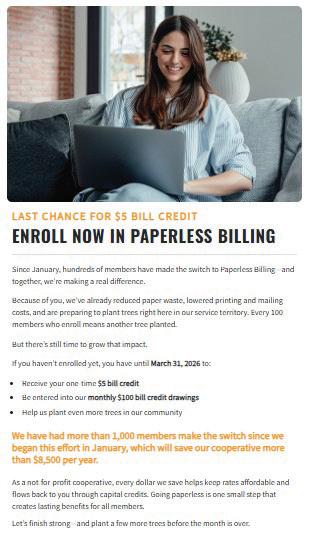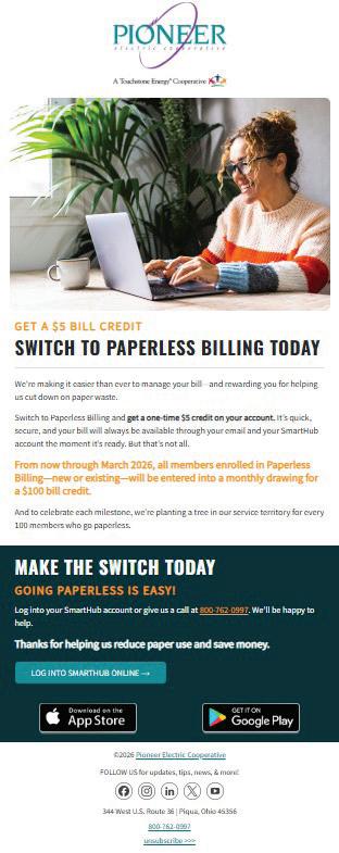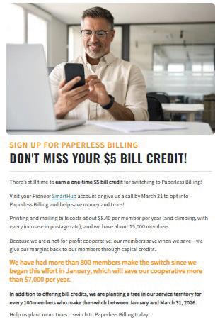 Pioneer Electric launched a campaign encouraging members to switch to paperless billing, reducing print and postage costs while promoting environmental stewardship.
