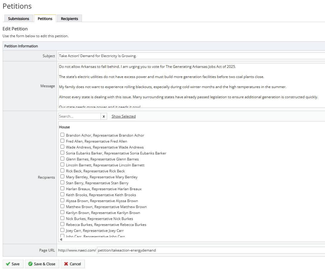 The system enables targeted outreach to members and provides a simple way for them to contact their representatives through coordinated email and petition-style campaigns. Members receive a call-to-action message explaining the issue and are invited to quickly send messages to their elected officials through the platform.