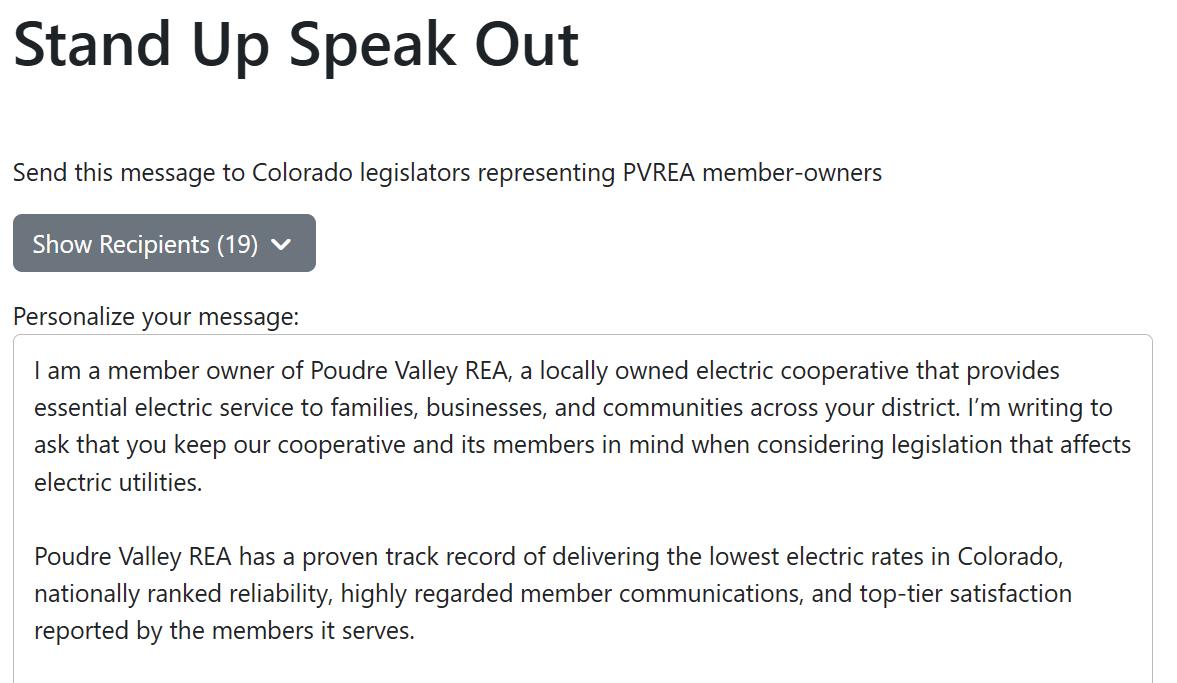 By enabling members to easily contact their legislators, Poudre Valley REA amplified its grassroots voice and demonstrated direct constituent engagement on key policy issues.