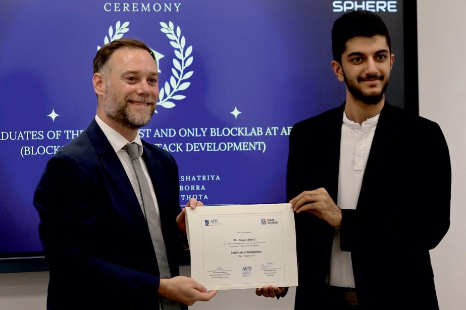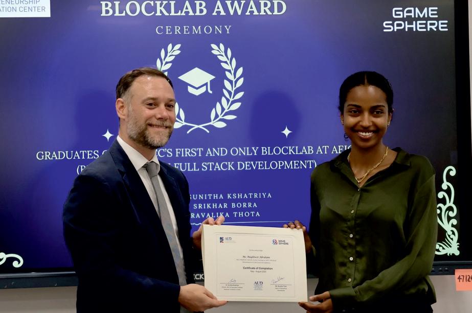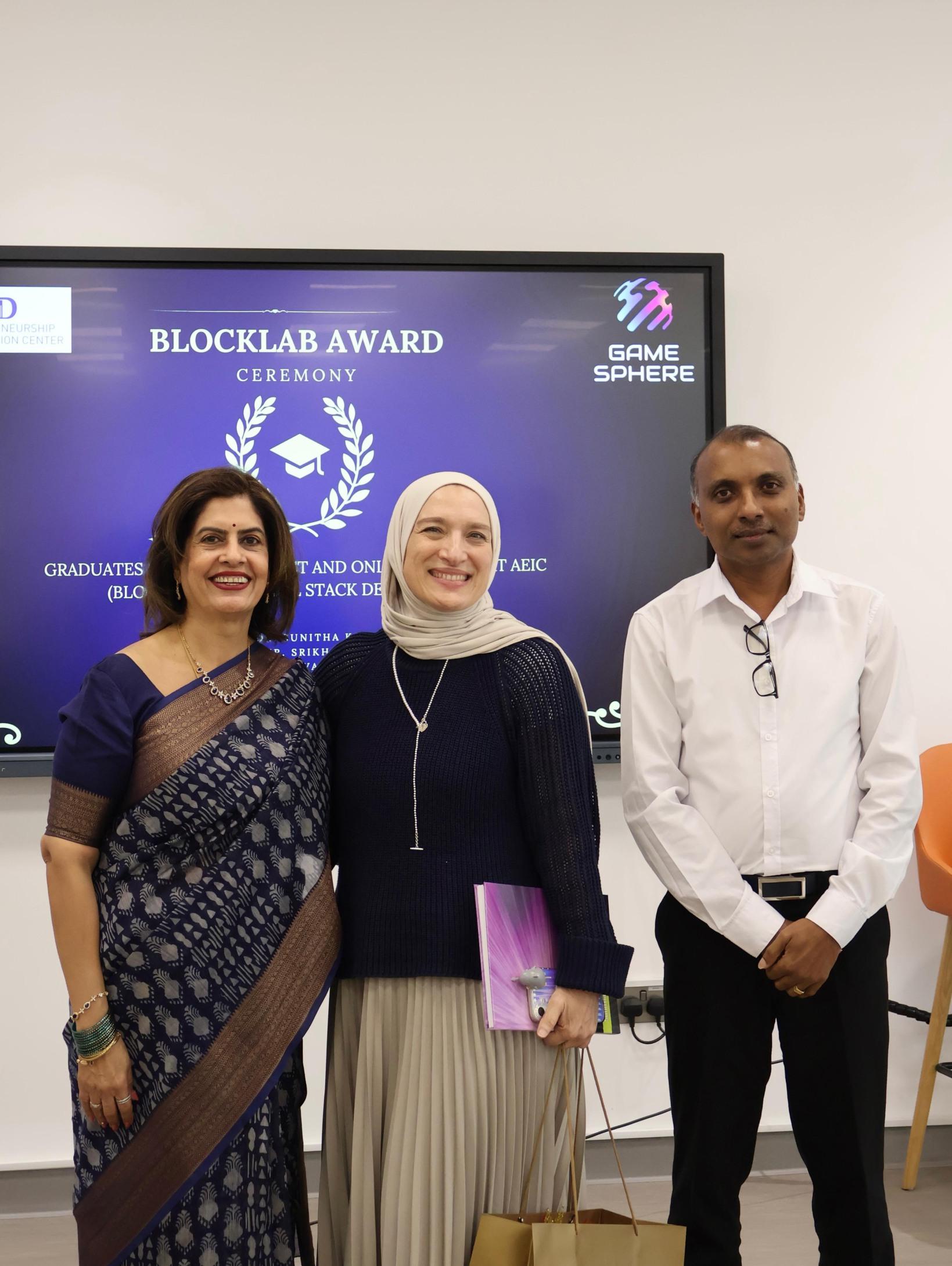 BlockLab Award Ceremony at GameSphere honoring graduates in blockchain and online learning. Joined by Dr. Nadera Alborno (Dean, School of Education), Dr. Vinod Pangracious (Chair, Electrical and Computer Engineering), and Dr. Sunitha Kshatriya