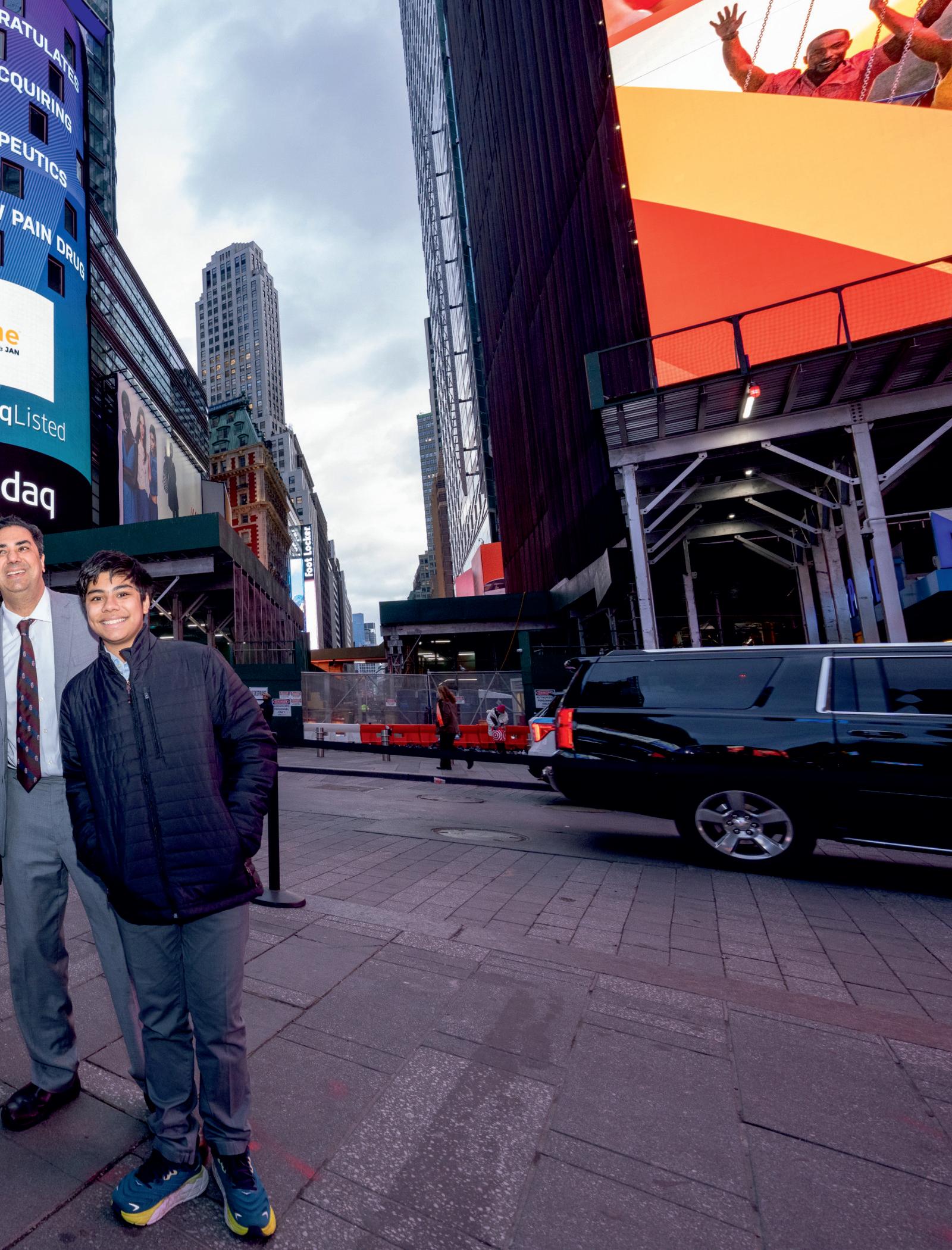 Dr Amol Soin pictured with his wife Yasmeen and sons Aviraj, Dhilen, Brijen and Bodhi in Times Square, NY celebrating the sale of Soin Therapeutics to JanOne on Nasdaq.