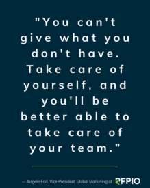 Words to live by Angela recalls advice she received from a mentor years ago, "You can't give what you don't have," and encourages others to prioritize self-care, especially those in leadership roles. Time, energy, confidence, and peace all fall under this mantra, according to Angela, ”Take care of yourself, and you'll be better able to take care of your team.”