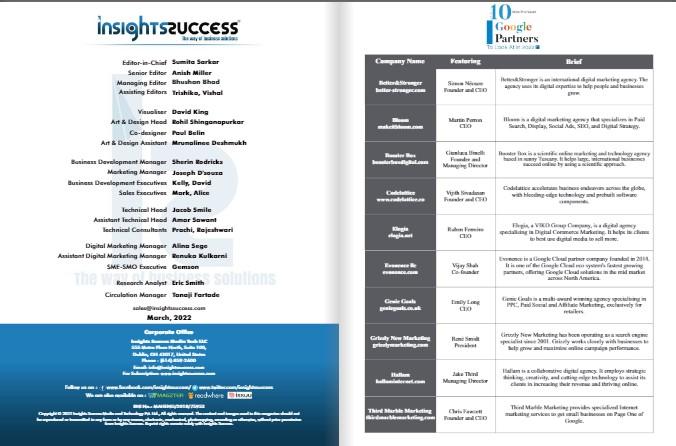 For More Information https://www.insightssuccess.com/the-10-most-prominent-google-partner s-to-look-at-in-2022-march2022/ #businesssuccessstories #BestBusinessMagazine #onlinebusinessmagazine #BestOnlineBusinessMagazine StoriesofInspirationalEntrepreneurs