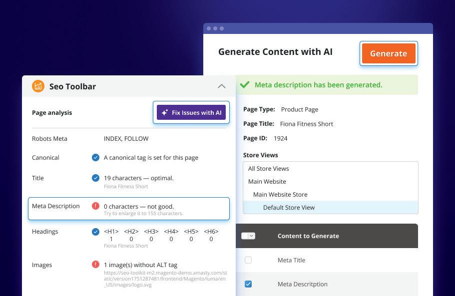 Atthesametime,Amastystaysaheadoftrendsby developingsolutionsbeforedemandfullymaterializes.A recentexampleisthesignificantupdatetotheirSEO Toolkitextension,whichintroducesanAIassistant.Store administratorscannowreceiveoptimizationsuggestions andimplementimprovementswithasingleclick.For businessesmanagingextensivecatalogs,thisinnovation savesdaysofmanualeffort,illustratingAmasty’sproactive approachtofuture-readysolutions.