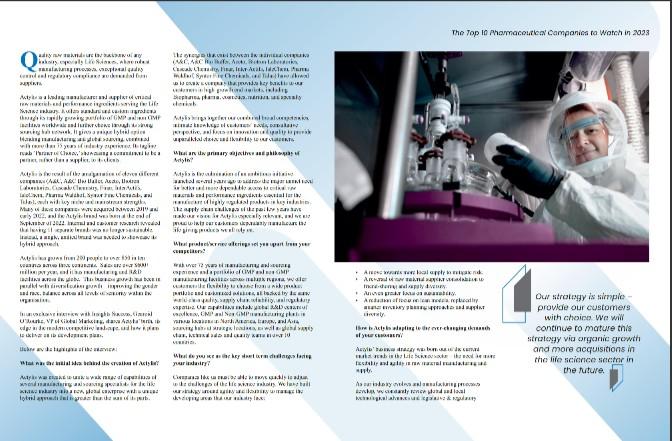 Actylis is a leading manufacturer and supplier of critical raw materials and performance ingredients serving the Life Science industry. It offers standard and custom ingredients through its rapidly growing portfolio of GMP and non-GMP facilities worldwide and further choice through its strong sourcing hub network. It gives a unique hybrid option blending manufacturing and global sourcing, combined with more than 75 years of industry experience. Its tagline reads ‘Partner of Choice,’ showcasing a commitment to be a partner, rather than a supplier, to its clients.