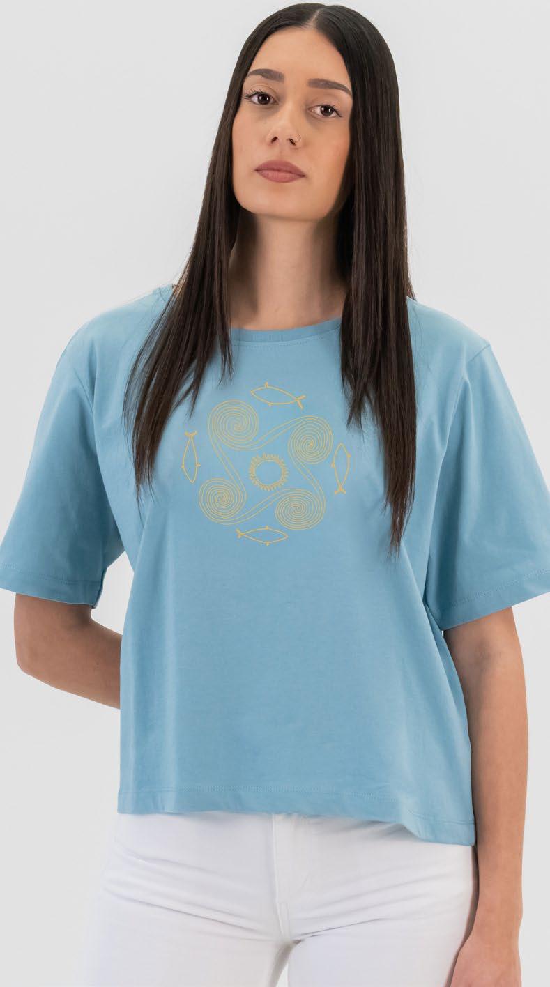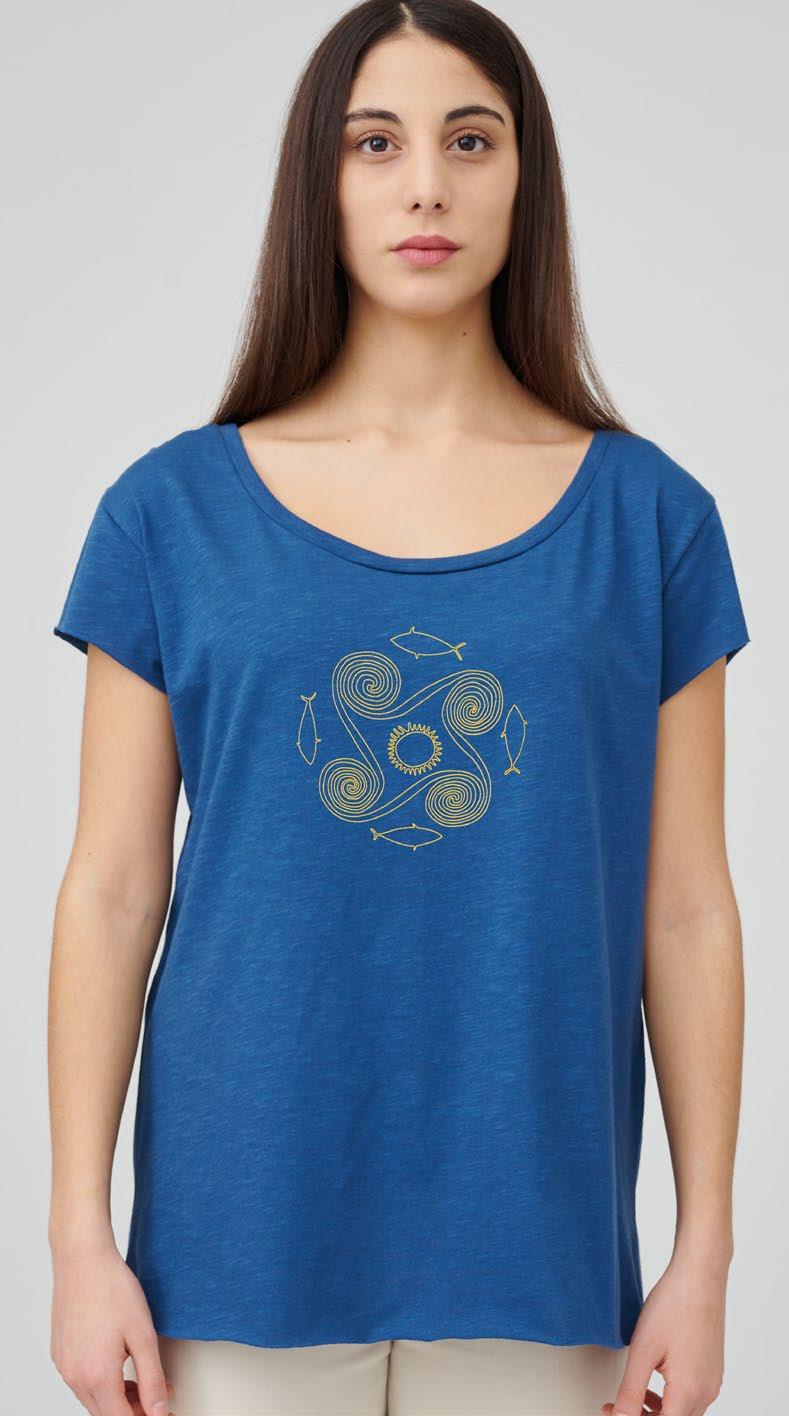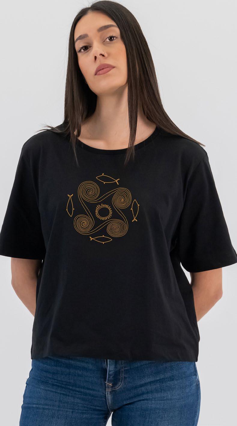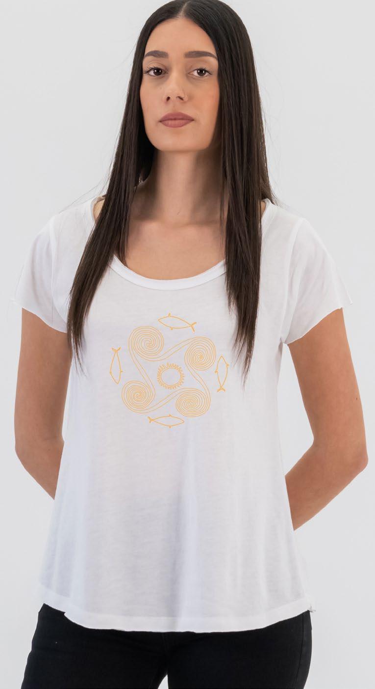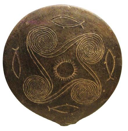 Intertwined spirals under the burning sun symbolize the evolving journey of life. Pattern inspired by frying pan, Early Cycladic, 2700 BC.