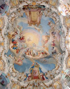 ヴィースの巡礼教会 奇跡の伝説が残る 「南ドイツの宝石」 バイエルンの草原にポツンとたたず む小さな教会。これが「ドイツ・ロ ココの最高傑作」と評される世界遺 産のヴィース巡礼教会。教会の起源 は1738年に起きた「キリストの 像が涙を流す」という奇跡。これに より巡礼地としての人気が高まった ことを受け、ロココ建築の第一人者 であるドミニクス・ツィンマーマン が約10年かけて完成させた。一歩 中に入れば、巡礼者は華麗なフレス コ画とスタッコ装飾で彩られた天井 に目を奪われる。
