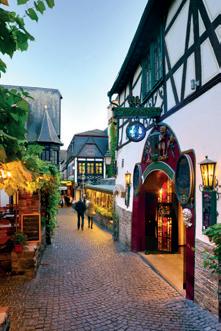ライン川クルーズ、ロマンチック街 道、古城街道などドイツの観光名所 へのアクセス抜群! ドイツでは珍しい高層ビルも目に入 るが、文豪ゲーテを生んだ文化と芸 術の中心地には、可愛い中世の街並 みも残っている。 レーマー広場(Römerberg)のあ る旧市街には200軒以上の屋台が 軒を連ね、ドイツ最大級かつ最古 (1393年)のクリスマス・マーケッ 高層ビル群と中世の街並みが混在する街 トと言われている。地元の人が自慢 する二階建てのメリーゴーランドは レトロでゴージャス。子どもだけで なく大人も乗り込み、おもちゃの国 のような幻想的な雰囲気を楽しむ。 名物リンゴ酒(Ebbelwei)は、冬 季限定で温めたものも提供される。 フランクフルトの魅力をもっと発見 したい方は、リンゴ酒電車(土日祝 のみ)に揺られながら街を一周して みて。 5. Frankfurt am Main フランクフルト 場所:Römerberg、Paulsplatz、Mainkai、Hauptwache、 Friedrich-Stoltze-Platz 、Roßmarkt 会期:2022年11月21日〜12月22日 OPEN:10:00-21:00(日11:00-21:00) URL:www.frankfurt-tourismus.de Frankfurter Weihnachtsmarkt 場所:Rheinstraße、Marktplatz、 Oberstraße、Drosselgasse 会期:2022年11月21日〜12月23日 OPEN:月〜木、日曜11:00-20:00(金土21:00まで) URL:www.ruedesheimer-weihnachtsmarkt.de Rüdesheimer Weihnachtsmarkt 場所:Marktplatz 1, 64720 Michelstadt 会期:2022年11月25日〜12月23日 OPEN:水木14:00-20:00 金14:00-21:00 土11:00-21:00 日11:00-20:00 URL:www.michelstaedter-weihnachtsmarkt.de Michelstädter Weihnachtsmarkt 場所:Altstadt, 69117 Heidelberg 会期:2022年11月21日〜12月22日 OPEN:11:00-21:00(土 22:00まで) URL:www.heidelberg-marketing.de Heidelberger Weihnachtsmarkt 観光局:Römerberg 27, 60311 Frankfurt am Main OPEN:月〜金9:30-19:00 i 6. Rüdesheim リューデスハイム ドイツ・ワインを代表する白ブドウ の品種リースリングの名産地で、世 界遺産のライン川中流域に位置する 街。狭い路地にはワイン屋さんや レストラン、お土産屋さんが連な り世界一陽気な小路「つぐみ横丁 (Drosselgasse)」は一年中、活 気がある。 「世界で一番陽気な小路」でワインを一杯 地元のワイン醸造家のグリューワイ ン(Glühwein von Winzer)や、 地元産のブランデー「アスバッハ」 を使ったアルコールの強い大人の コーヒー飲料「リューデスハイマー・ カフェ」をお試しあれ。寒い季節も、 お腹の中からポカポカに。 ドイツ三大名城の一つに数えられ るハイデルベルク城とネッカー川 (Neckar)沿いに広がる旧市街の 街並みは古城街道を代表する美し さ。ドイツの詩人や哲学者、文化人 がそぞろ歩き、思索の旅に出た「哲 学者の道」の高台から、その絶景を 一望できる。 ゲーテやショパンが愛したドイツ最古の大学町 ここでは、ブルーベリーのグリュー ワイン(Heidelbeerglühwein)が 名物だ。白とピンク色の2種類で、 ロマンチックなクリスマスの雰囲気 を堪能しよう。 地元定番のお土産は「学生のキス」 (Studentenkuß)というチョコ。 この街で最古のカフェ、クネーゼル (Café Knösel)で購入できる。 8. Heidelberg ハイデルベルク
