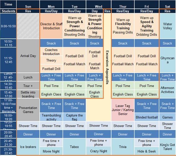 After breakfast, resident campers will head to their activities and lessons. After the midmorning snack, they will have time for free play in the swimming pool and sports activities and games, followed by lunch. In the afternoon, the students will continue with their language lessons and sports activities until snack time, after which all residential students will gather and prepare for an evening of fun activities.