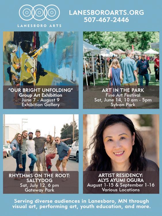 Lanesboro Art in the Park, June 14, 10 am-5 pm. Lanesboro’s Sylvan Park comes alive with 90-plus fine art and craft booths, family art activities, local food and beverage vendors, and live music. Enjoy local food and craft beer offerings, along with the tunes of The Rutabaga Brothers (10-11:30 am), Marques Morel (12-1:30 pm), Molly Brandt (2-3:30 pm), and Driftless Jazz (4-5 pm). Admission is free, accessible parking is available, and socialized dogs on leashes are permitted. Art in the Park is presented by Lanesboro Arts and is made possible by the voters of Minnesota through a Minnesota State Arts Board Operating Support grant, thanks to a legislative appropriation from the arts and cultural heritage fund. For more information call 507-467-2446 or visit lanesboroarts.org/aip
