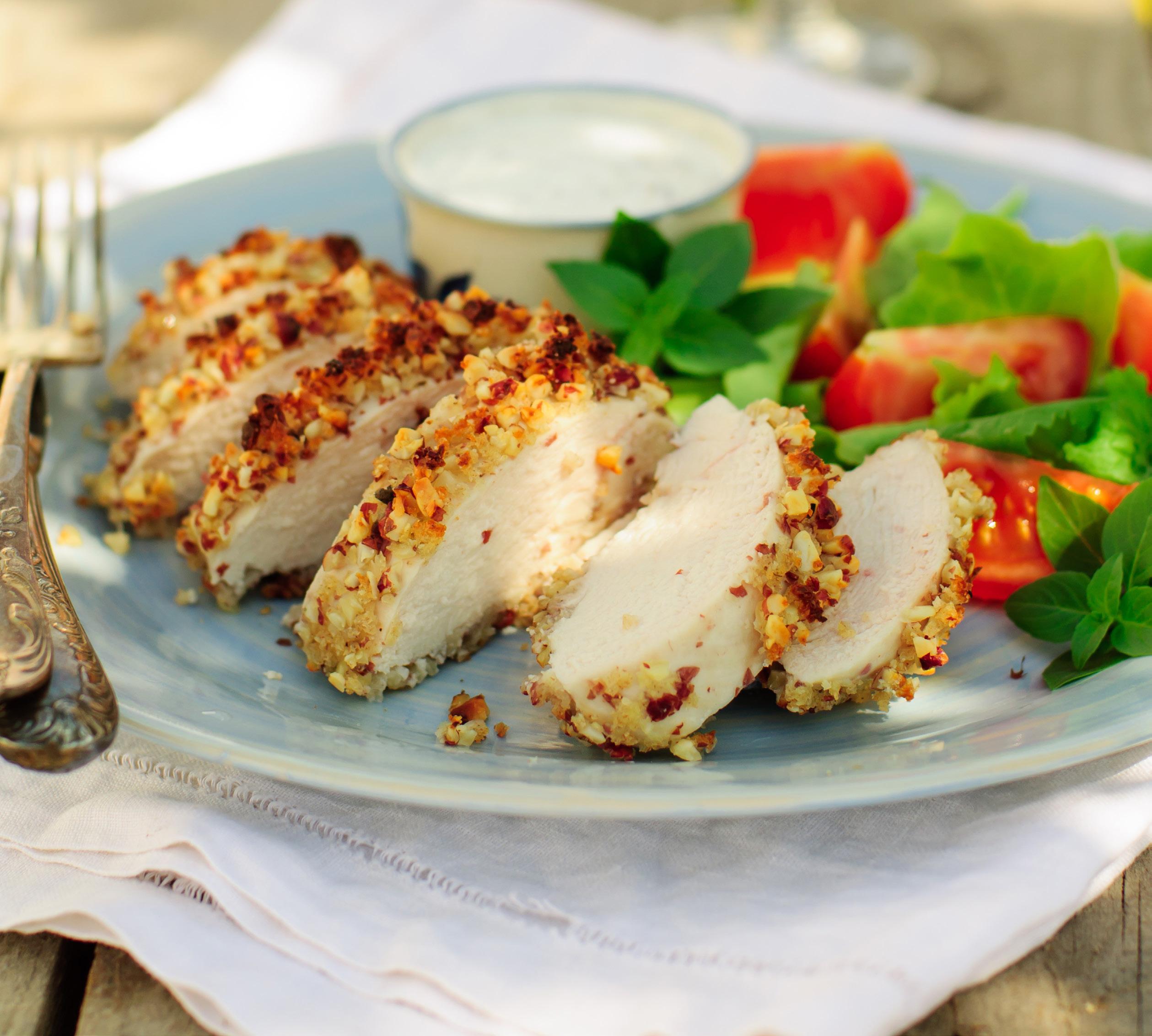 Place the walnut-coated chicken breasts on the prepared baking sheet. Bake for 20–25 minutes, or until the chicken reaches an internal temperature of 165°F (74°C) and the walnut crust is golden brown.