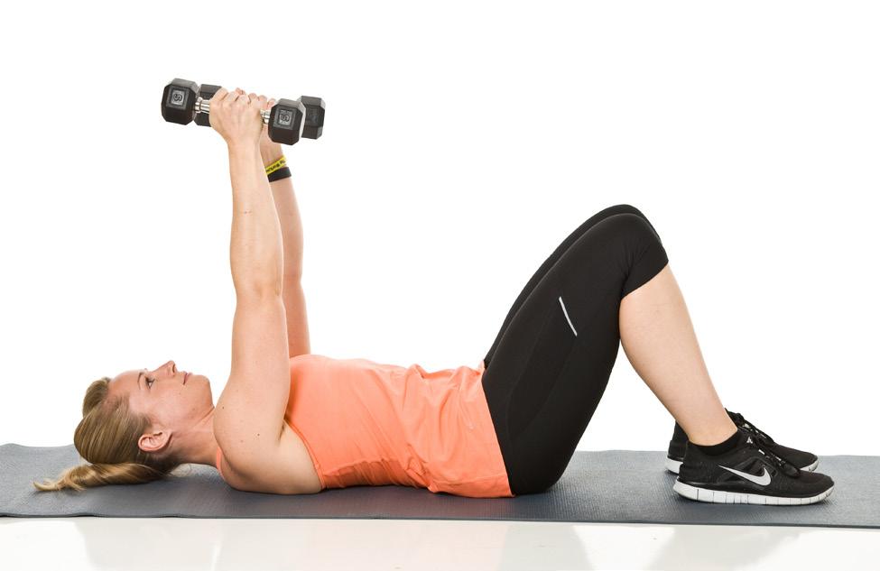 Lie on your back on the floor. Keep your knees bent and feet on the floor. Using a pair of dumbbells, extend your arms straight up; the dumbbells should be facing each other.To begin the movement, lower the dumbbells toward your ears until your arms are bent at a 90 degree angle. Return to the starting position. Perform 3 sets of 15 reps.
