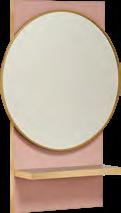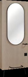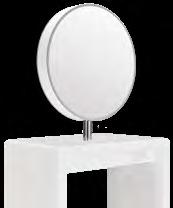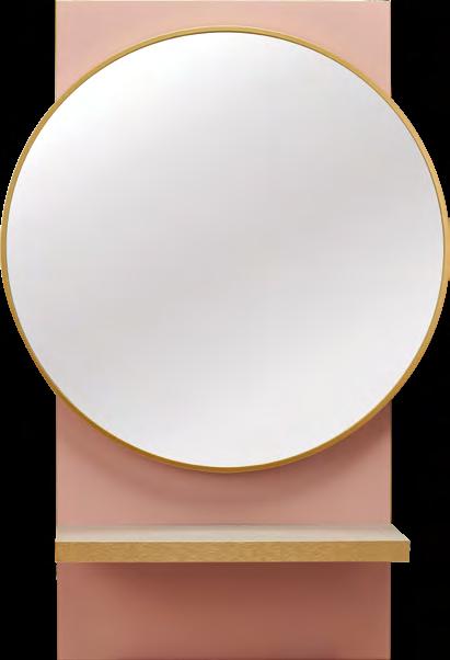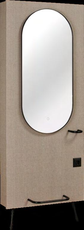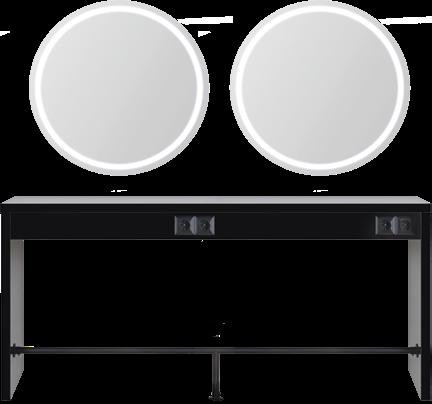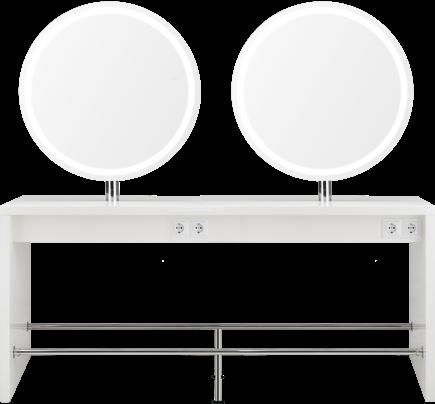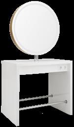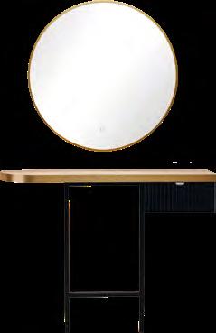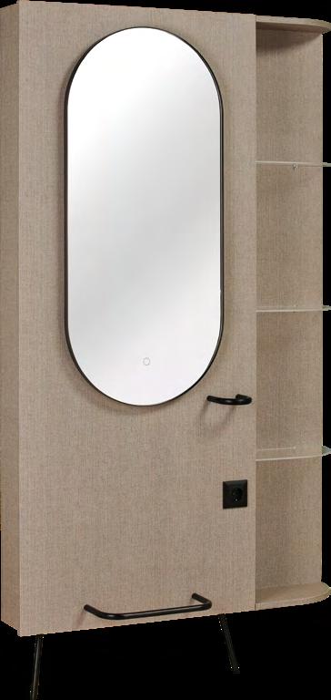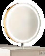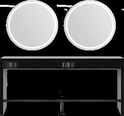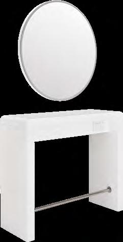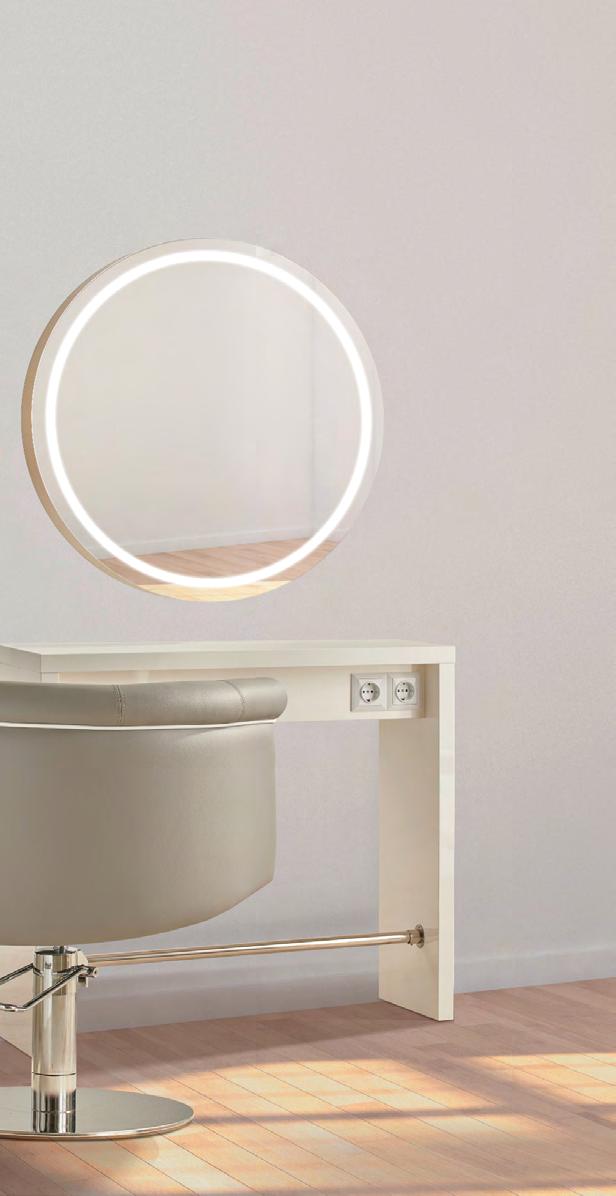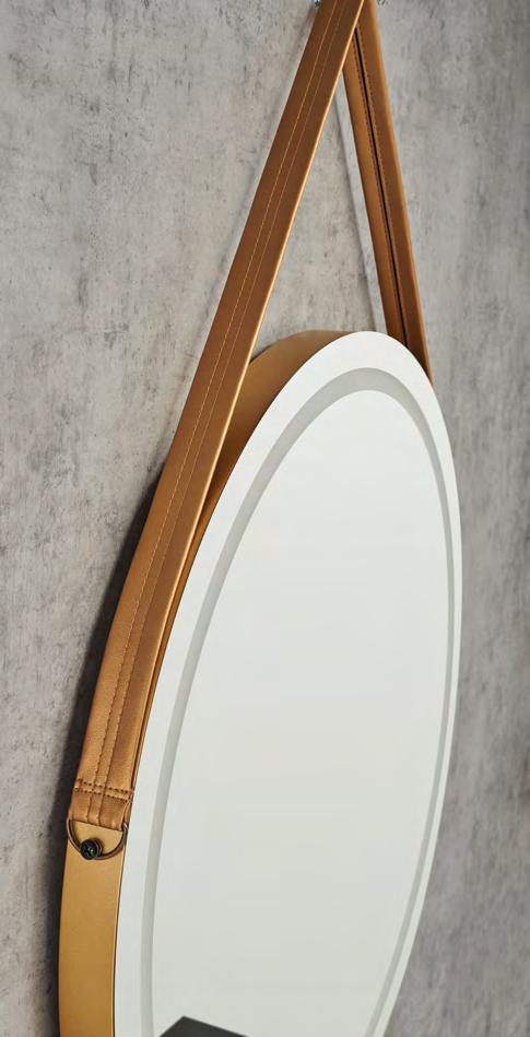 Okragłe lustro z lakierowaną ramą, na pasie ze skaju. Oświetlenie LED w standardzie. Półka z szufladą wbudowanymi gniazdkami elektycznymi.