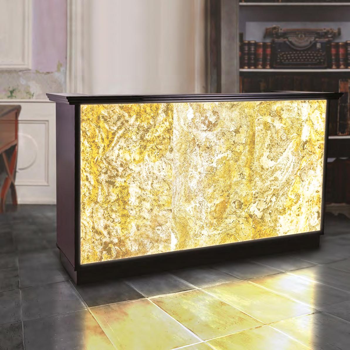 Fronts made of high-gloss lacquered MDF. Bodies made of laminated board. Marble top or basin as an option.