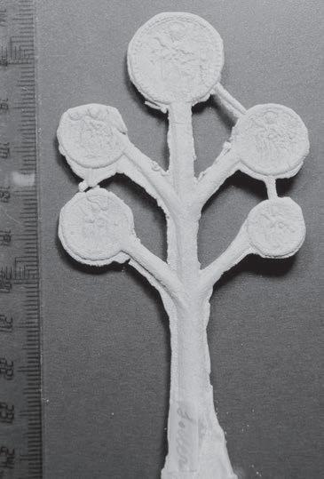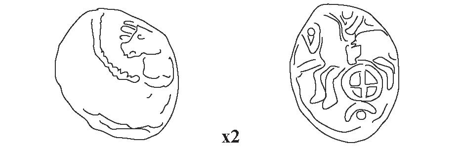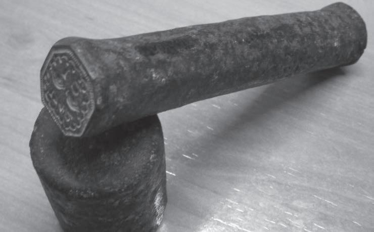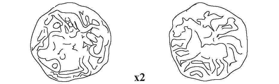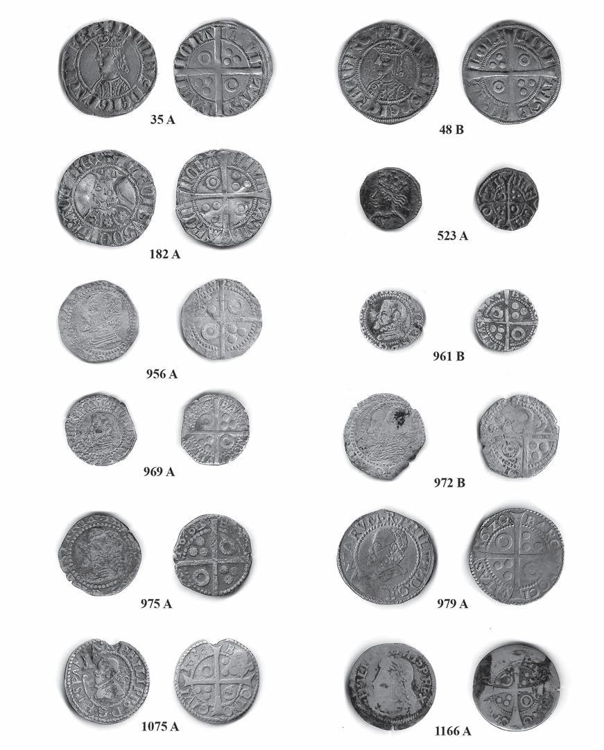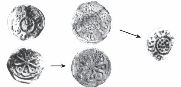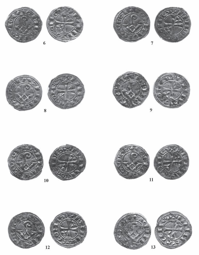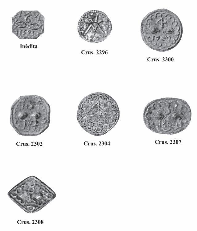 vament, encunyacions de tipus taifa. Cal remarcar dues particularitats d’aquest conjunt. La primera és que no hi ha cap moneda sencera, és a dir, la totalitat del conjunt està format per fraccions i fragments de dirham, la qual cosa implica que totes les llegendes es troben incompletes. La segona és que en cap dels exemplars no és possible llegir la data d’encunyació, una circumstància que constitueix, probablement, un cas d’autèntica mala sort, atès l’elevat nombre d’exemplars estudiats. A partir del material a l’abast, Ilisch ha reconstruït, com si fos un trencaclosques, l’aspecte que tindrien aquestes monedes, documentant-ne quinze tipus diferents que, al seu torn, es poden dividir en sis grups:
