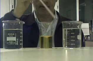 Figura 6. Precipitación de carbonato de calcio: a) disolución transparente de Ca(OH)2; b) después de soplar se enturbia.