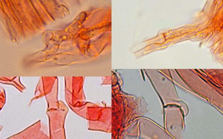 Espores llises, subgloboses, de 11-14 (16) × 10-13 µm. Q = 1,11 (30 espores). Basidis tetraspòrics, de fins a 62 × 20 µm, amb esterigmes de fins a 6 µm, amb un coll llarg i estret. Vel format per esferòcits de 25-75 µm, amb hifes filamentoses de 2-8 µm, amb alguns engruiximents puntuals.
