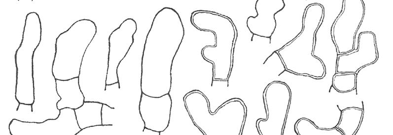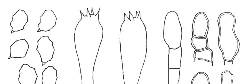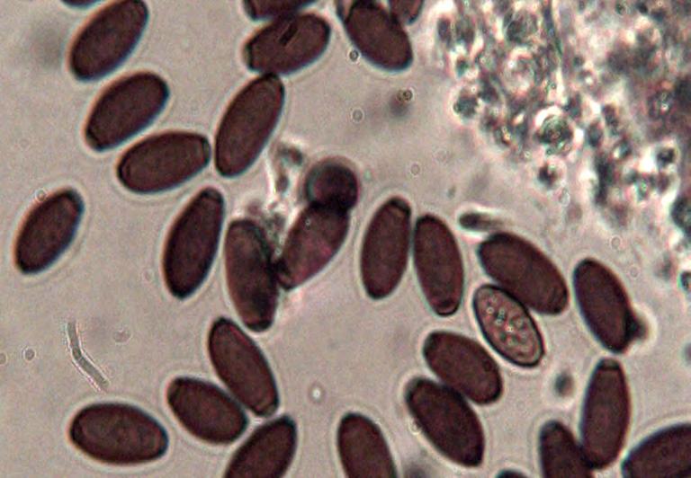 MATERIAL ESTUDIAT: Montenartró, Barranc de la Pega (Pallars Sobirà), UTM 3568 47002, sobre restes de fusta degradada quasi immersa dins l’aigua, 29-09-2011, JJMM 1807D. Espores el·líptiques, llises, amiloides, bigutulades, que mesuren 5 x 2 µ.