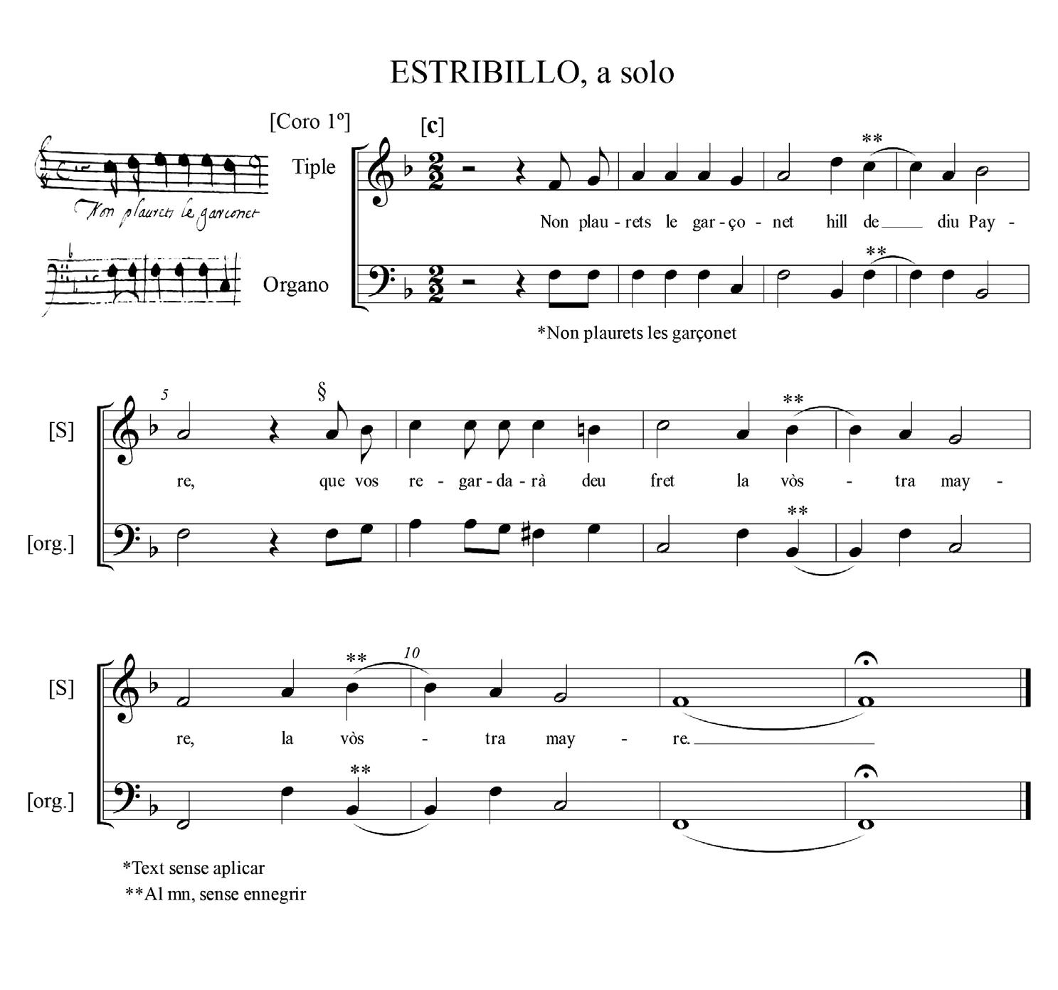 Pel que fa a la música de les farses en llengua vernacla, acostumem a trobarnos amb unes frases musicals molt cantables amb melodies que es van repetint en cada estrofa. Algunes fonts en llengua vernacla empren una melodia típica de recitat en què les frases musicals tenen un fragment d’inici, un altre fragment central de recitat, en el qual augmenta o disminueix el nombre de nota de recitat, segons quina extensió tingui el text, i una part de cadència tant de frase com de final d’estrofa.