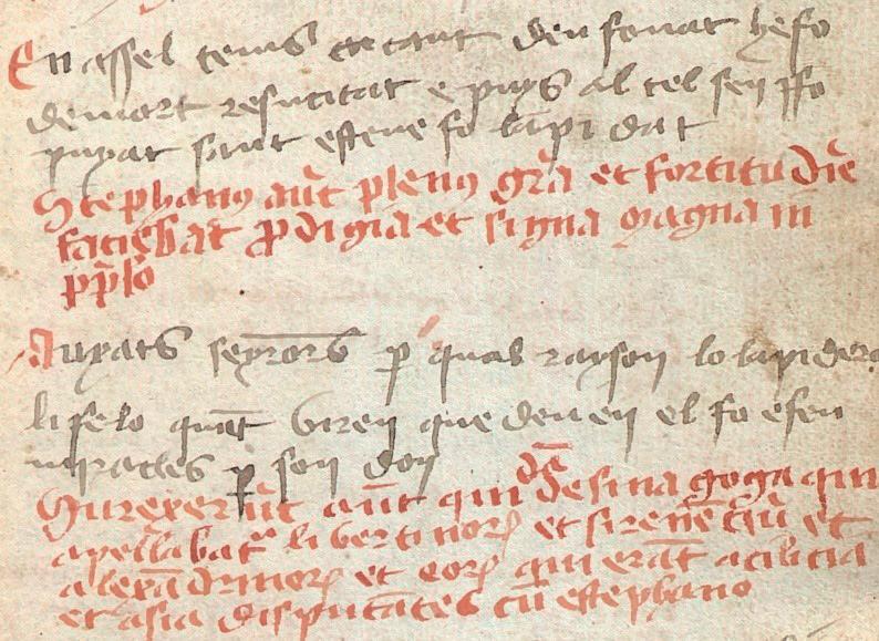 túrgic i també, tal com proposa Huglo, per la complexitat de cantar en alternatim el to de la recitació de la lectura (lectio) i el to de la farsa, per part de dos o més cantants separats en dos grups.9 En manuscrits posteriors és freqüent trobar solament el text amb l’íncipit de la lectio10 i, fins i tot, solament amb la farsa. Dennery assenyala que les lectures farcides i els trops del propi estan escrits de manera que sigui fàcil distingir el text original.11 Així s’ha pogut constatar en algunes de les fonts de les epístoles de sant Esteve, especialment en aquelles en què manca la música; sovint trobem diferent mida o tipus de lletra per a cada text, caplletres per poder diferenciarlos o tintes de diferents colors. En la figura 1 es pot observar un dels exemples en què es diferencia entre el text de la lectio original, en aquest cas en vermell, i el de la farsa, en negre.